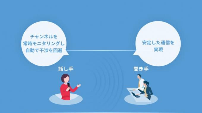 「他の電波を発する機器とかぶらない周波数帯を使う」これが電波干渉を避ける重要なポイントです。その点でWX-SR200Aシリーズが使用する「1.9GHz帯」は、他の機器の影響をうけにくく、かつチャンネル使用状況を常時モニタリングしているため、干渉が発生しても自動的に他チャンネルに切り替え、安定的な通信が可能です。