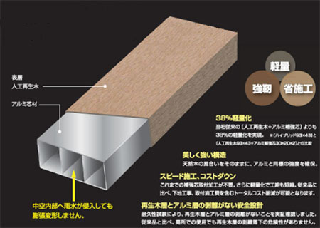 アルミ型材を芯材に使用しており耐候性・加工性・施工性に優れており、表面仕上げは木材・プラスチック再生複合材の人工木材なので柔らかな木質間を演出します。