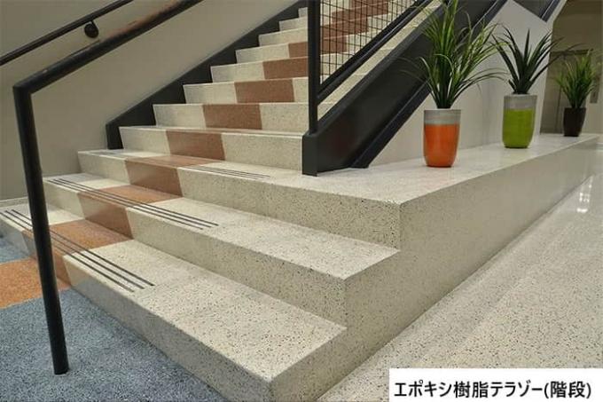 エポキシ樹脂テラゾーは「ほぼ無限のデザイン・着色」「ワンランク上の美しさ」「シームレス」「優れた耐久性」「工期の大幅短縮」等を実現する人造石です。空港、病院、レストラン、学校等様々な屋内の床で使えます。