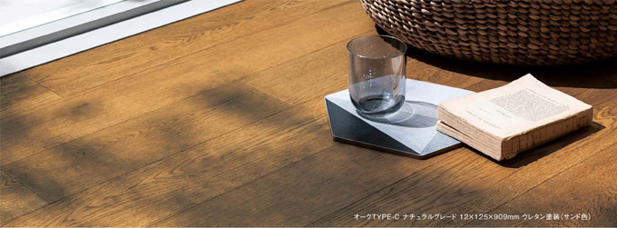 オークTYPE-Cフローリングは長さ909mmの使いやすいサイズで、床暖房対応と機能性に優れていながら、表層のオーク材が厚いので無垢に近い自然な質感を感じられます。また、カラーバリエーション豊富でさまざまなシーンに合わせてお選びいただける人気のシリーズです。