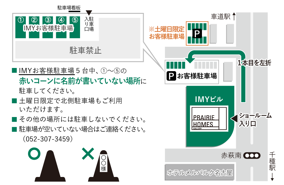 【駐車場】IMYビル北側にお客様駐車場がございます。土曜日のみ、プレイリーホームズ従業員駐車場もご利用いただけます。