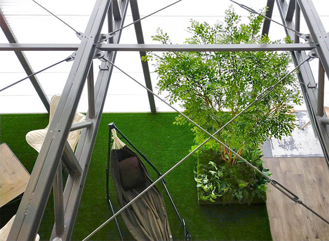 人工芝が敷かれた休憩スペースは、開放感あふれる吹き抜けから自然光がたっぷりと降り注ぎます。ハンモック、キャンピングテーブル、チェア等が配置され、お洒落なグランピング施設のようなスタイリッシュな空間が広がります。高い吹き抜けを見上げた際には、自然を感じられるシマトネリコの木漏れ日が印象的です。そんなくつろぎ空間のシンボルツリーとして、特注品の2.5mサイズの巨大人工観葉植物をご提案いたしました。