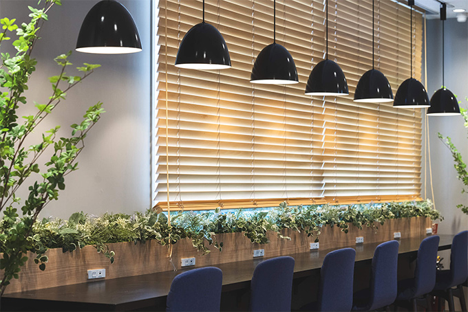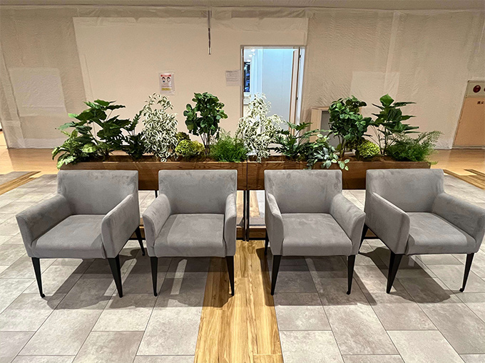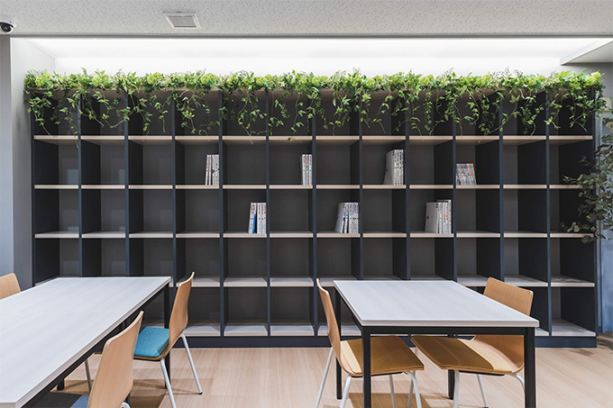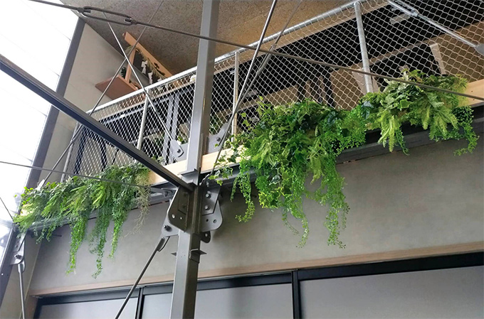 勉強に集中できる環境はもちろんの事。ここに訪れるの方々がこの場所でひと息入れられるような、まるでお気に入りのカフェでリラックスできるような空間をイメージしてフェイクグリーン装飾のご提案をさせていただきました。
