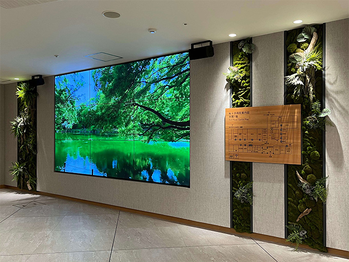 大きなデジタルサイネージと院内の案内マップを囲むクールな壁面緑化のグリーンパネル。