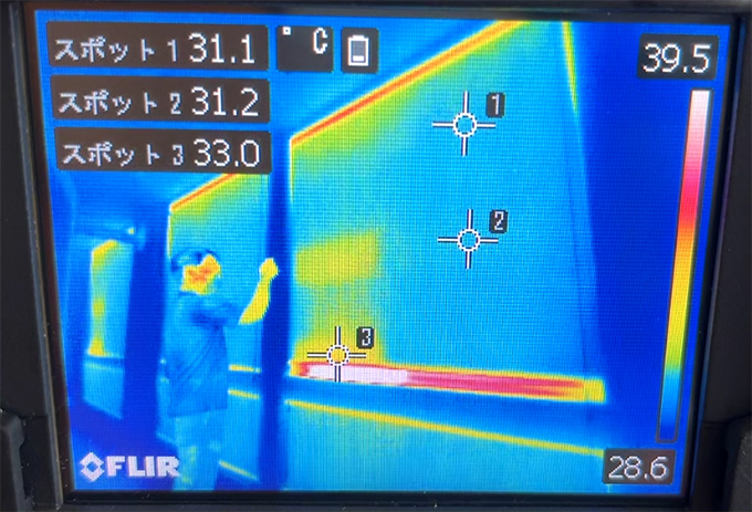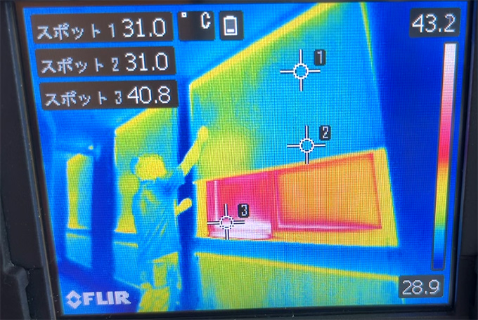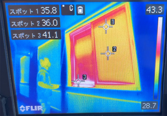 樹脂サッシのガラス表面温度は、35.8~41.1℃、樹脂枠は43.3℃を計測しました。外部の熱影響が強烈に分かります。
