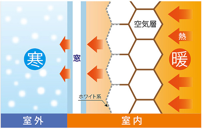 熱は、温度の高い方から低い方へと移動します。断熱ブラインド ハニカムaSsuの空気層(断熱層)があることで、室内の温かい熱が外へ移動することを抑制できます。