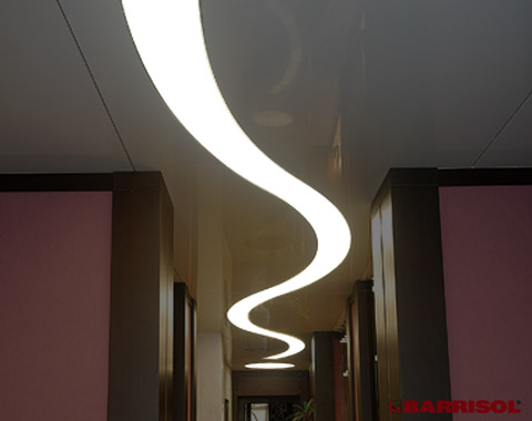 フランス生まれのリフォジュールスターシステムは、豊富なバリエーションの柔軟な膜(特殊配合樹脂製シート)と軽量なフレーム(アルミ製)から構成された空間デザインシステムです。このシステムを光や印刷と組み合わせることにより、公共施設をはじめ、商業ビル、店舗等をより一層クリエイティブな空間にすることができます。あらゆる形に柔軟に対応できるシートとフレキシブルなレールにより、表現の自由を奪いません。