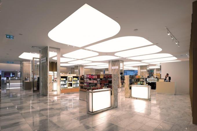 アクリルやガラスでは不可能な「大面積照明」を可能にしました。立体形状・シームレスを得意とする「スターシステム」により、一面のみならず周囲まで光る立体造形照明を1 枚のシートで仕上げることが可能です。