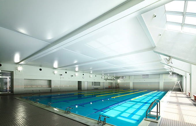 室内プールの天井は、常に湿気にさらされるため、天井落下のリスクは非常に高く、これまでも天井落下が絶えません。リフォジュール膜天井は湿気を吸わないシートのため、このような多湿環境に最適な天井システムです。