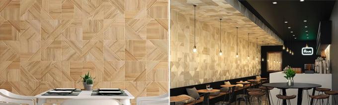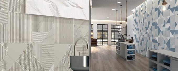 組み合わせやタイルの向きによって壁面の表情が大きく変わるスペイン製装飾タイル「Stripes」