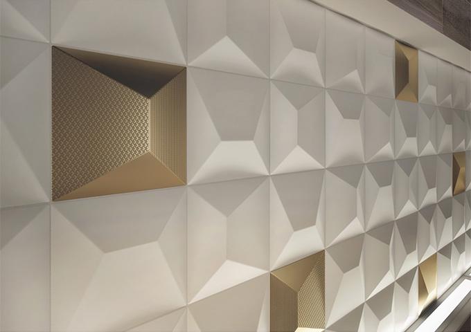 レージェンシーで取り扱う装飾タイルのラインナップのなかでも、装飾タイル「Shapes」は、タイルの3D形状が立体感ある独創的・意匠性の高い空間を演出し、ホテルやレストラン・店舗はもちろん、ご自宅のなどあらゆる空間の壁面を華やかでラグジュアリーな空間へと創造してくれます。
