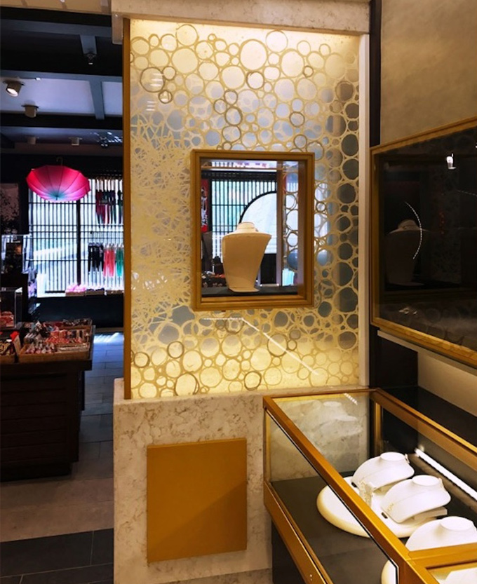 和紙のやわらかい質感とガラスの透明感が融合がしたことにより、今まで使用出来なかった箇所への施工が可能になるのはもちろん、清掃の際の水拭きなどを行うことが可能となります。