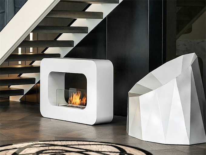 燃焼する際に有害物質や煤などが発生しないため、通常排気に必要な煙突が必要ない「エタノール燃料暖炉」。