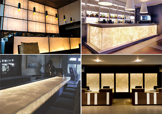 素材の持つ美しい透明感と温かさから、店舗やホテル・レストランなど あらゆる空間デザインの装飾に最適なデコレーションストーン・パネル