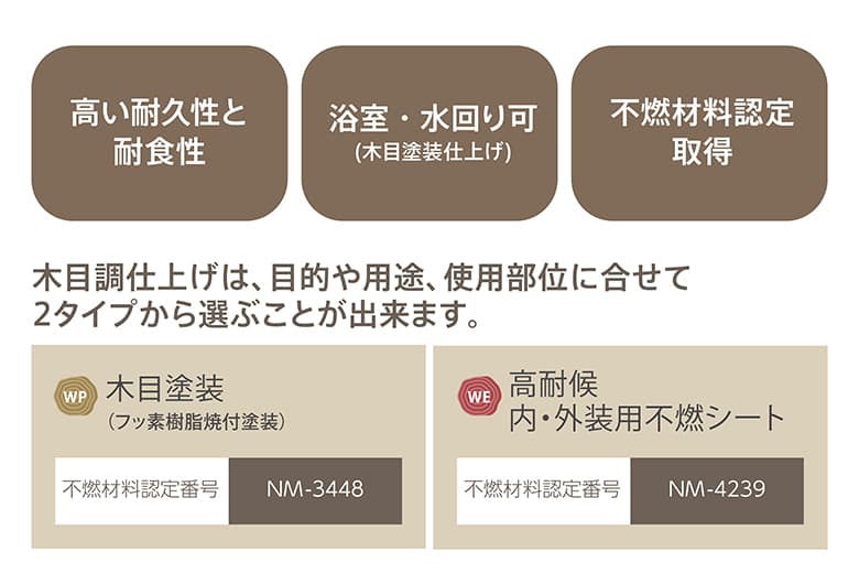 木を使いたいけれど不燃材料認定が必要な内装、浴室や水回り、外壁への使用も可能です。