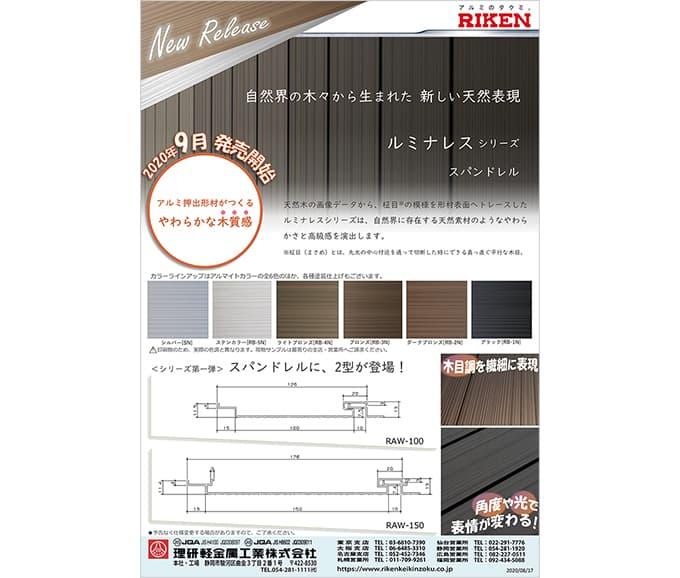 アルミニウム製品の加工から販売までを一貫で行う、理研軽⾦属⼯業株式会社(静岡県静岡市駿河区、社⻑/⼊山豊)は、天然木の木目模様をアルミ押出形材で加飾表現した内外装仕上材「ルミナレス」シリーズを9月1日より展開しました。新製品は壁や天井の仕上材として使用されるスパンドレルに2サイズをラインアップしました。