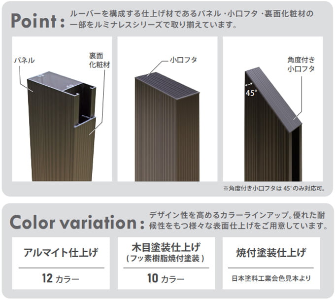 建材ナビ・スタッフからのコメント 天然素材のようなやわら かな木質感と高級感を演出する人気シリーズ「ルミナレスシリーズ」に、新型ルーバーが追加されました。ボルト固定式タイプと直付けタイプの2種類となっています!