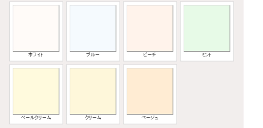ホワイト、ブルー、ピーチ、ミント、ペールクリーム、クリーム、ベージュの7色がございます。
