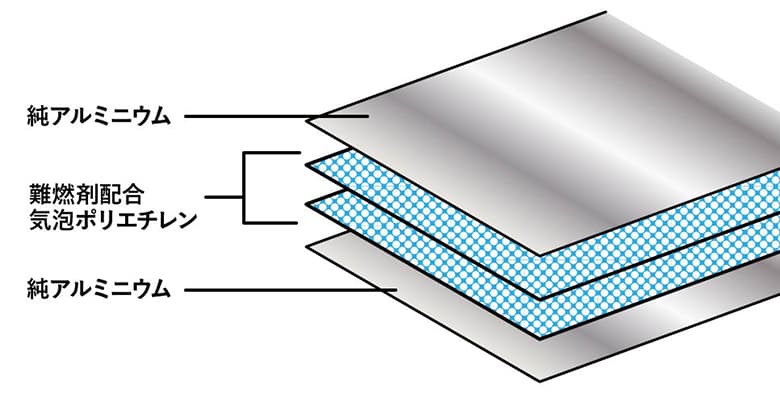 特殊な難燃剤を配合した高い難燃性の2層の気泡構造による高い断熱性能と、輻射熱反射率97%の純アルミ2層遮熱材とのW2層ハイブリット構造の高性能遮熱断熱材です。