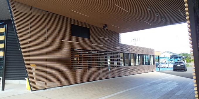 人工木材「Eee-Wood」は1本単位での販売なので、割付次第で材料のロスをなくし、コスト削減に繋がります。また、施工後もメンテナンス費用が掛かりません。