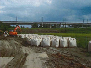 ■人でのかかる普通の土のう(2号土のう)の積上げ作業に比し施工が簡単な為、非常に建材的かつ、作業能率が上がります。