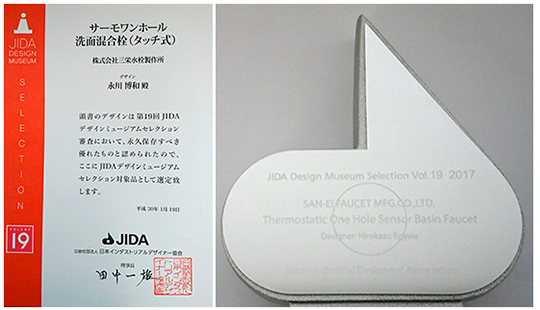 ■当社のサーモワンホール洗面混合栓(タッチ式)toccata が、公益社団法人 日本インダストリアルデザイナー協会(JIDA)デザインミュージアム委員会が運営する「JIDAデザインミュージアムセレクション Vol.19」におきまして、2017年度の選定商品となりました。