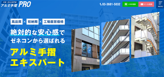 「アルミ手摺PRO」として屋号も新たに、大手メーカー様を超越する品質で工場直営価格で手摺・笠木の工事を承っております。