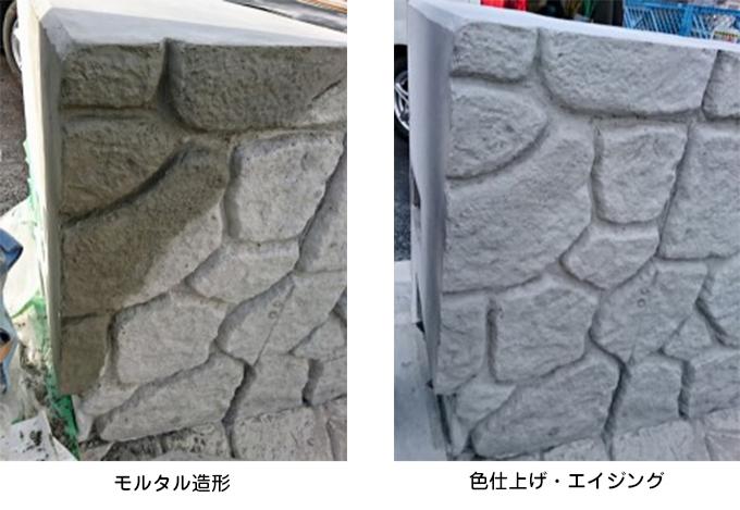 下地施工後、削り出して整形することで独特の風合いと圧倒的な存在感を生みだすことができます。そして形成したモルタルに着色などにより、より本物に見せる「エイジング」を施し仕上げていきます。