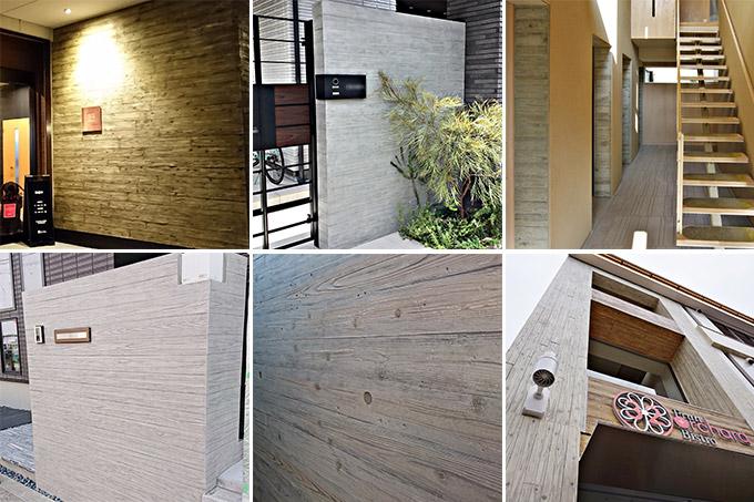 住宅の内外装を問わず、デザインとしてコンクリート感を演出できる『Concrete Art』は、木造構造の住宅の内壁、外構の擁壁・門柱にも、合板コンクリート打ち放し、又は、杉板木目コンクリート打ち放しを再現することができます。