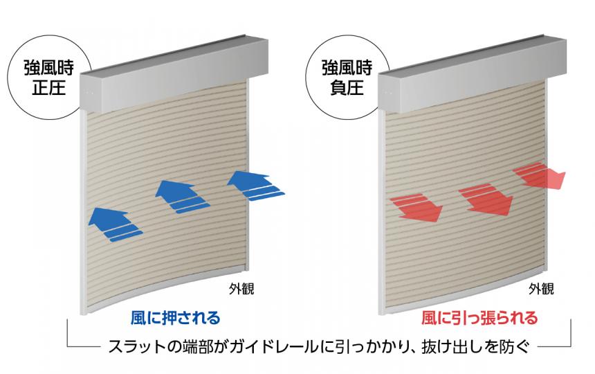 強風時の追加操作は一切不要。風圧を受けるとスラットの端部がガイドレールに引っ掛かり、ガイドレールからスラットが抜け出すのを防ぎます。