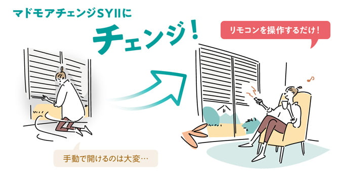 このたび「マドモアチェンジSY」の新モデルとして、新たに「マドモアチェンジSYⅡ」を発売いたしました。従来の「マドモアチェンジSY」ではシャッターボックス内に別置開閉機の設置スペースが必要でしたが、「マドモアチェンジSYⅡ」では開閉機を内蔵したシャフトの交換だけで電動窓シャッターとしてご利用いただけます。