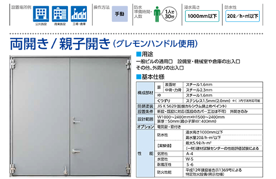 従来のスチールドアと同じ操作で浸水高さ1mまで対応可能な防水ドア