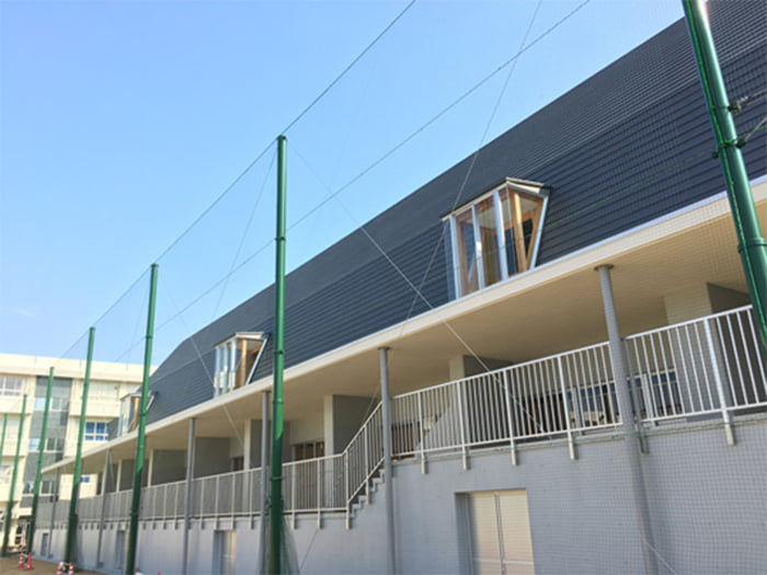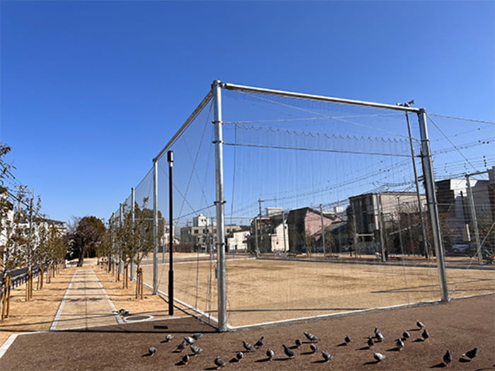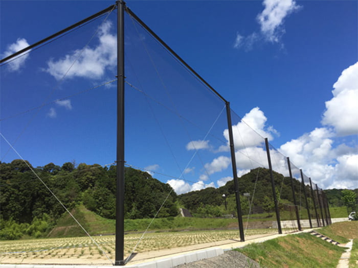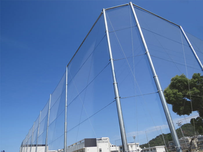 従来のネット(φ2.4)より線径が細いため、風の影響が少なく柱への影響が軽減されます。周囲の景観に合わせてネットの色をお選びいただけます。状況に応じ、カーテン・昇降式も可能です。