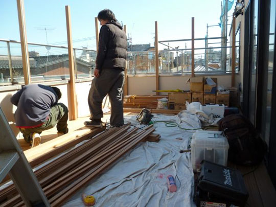 デッキ設置が終わり、フェンス支柱を立て込んでいます