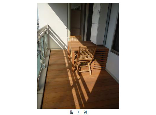パネルタイプのウッドデッキ(意匠登録出願済み)は大規模改修工事の際に取り外しが出来る様に10枚のスノコに分割してあります。