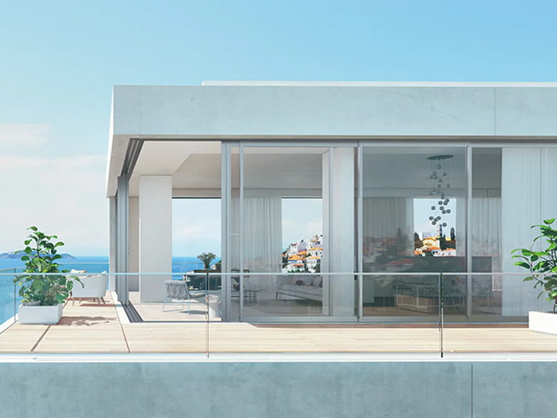 コーナー方立レスにより、視界を遮ることなくパノラマビューを最大限に活用できます。デザイン性と実用性を両立し、建物の外観にも大きな影響を与えます。