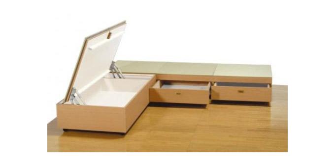 大掛かりな工事は必要なく、家具を置くように気軽に和の空間を実現できます。収納はボックスタイプで「ハッチタイプ」「引出しタイプ」「置き蓋タイプ」とあり、組み合わせも自由で生活が快適に。中でもハッチタイプは壁際に設置しても開閉可能な弊社独自の金物を採用しました。