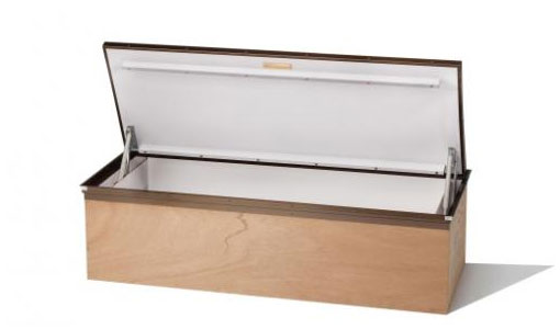 自動車のハッチバックの様な開閉操作感とフタ板に乗ってもヒンジ金具やガスダンパーに負荷の掛からない安心構造。