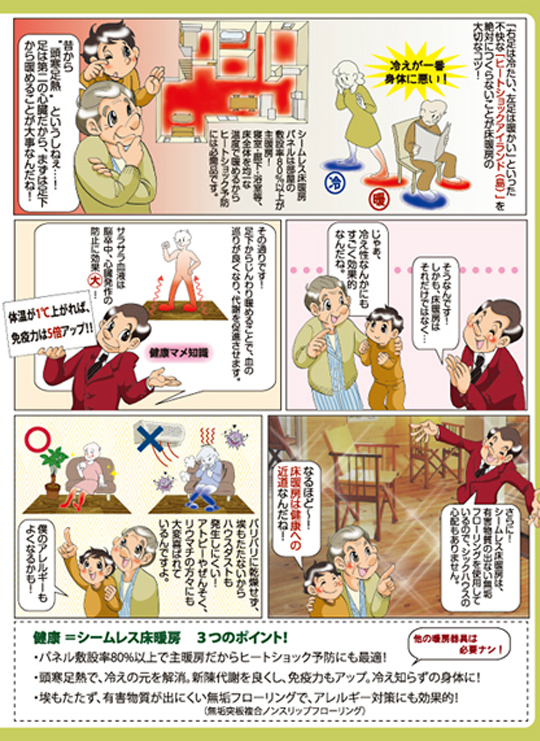 そこで株式会社 シームレス床暖房では、寝室 ・廊下・トイレ・洗面所・ 浴室・リビング・ダイニング・キッチンに続く動線に床暖房を設置して、できるだけ床面の温度差をなくす「温度バリアフリー」のご提案をしています。