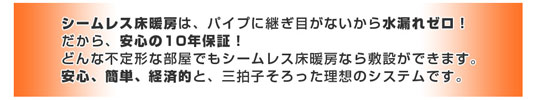 ①安心:シームレス床暖房は従来の銅管の代わりに超高分子架橋ポリエチレンパイプを使用。継手部分がないから100%水漏れナシ。パイプの寿命は半永久的。