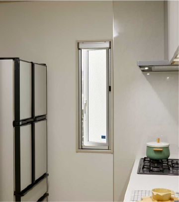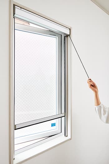 上部にスッキリと納まるシンプルな網戸で、片開き窓や両開き窓からの通風を実現。