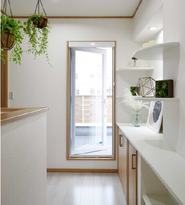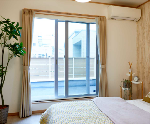 眺望性の優れたロールアップ網戸が、窓から心地よい風を取り入れます。ロールアップ網戸とは、ブラインドのように上部のボックスにネット(防虫網)が収納される網戸のことです。ネットは上部に巻き上げられて収納されるので、使わない季節は網戸の存在を感じさせません。開閉操作は、1本のチェーンコードで上げ下げ開閉操作をするループレスタイプのため、小さなお子様がいたずらをして事故につながる心配がございません。従来のループタイプに比べ軽くスムーズな開閉が可能です。