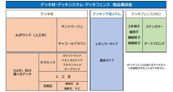 この度、デッキ関連商品のメインを現行の「合成木材」から昨年発売し好評の高耐候人工木デッキ材『ルポウッド』に変更し、デッキ下地システムも一部改良及び価格見直しするなど、商品構成の変更をさせていただきます。