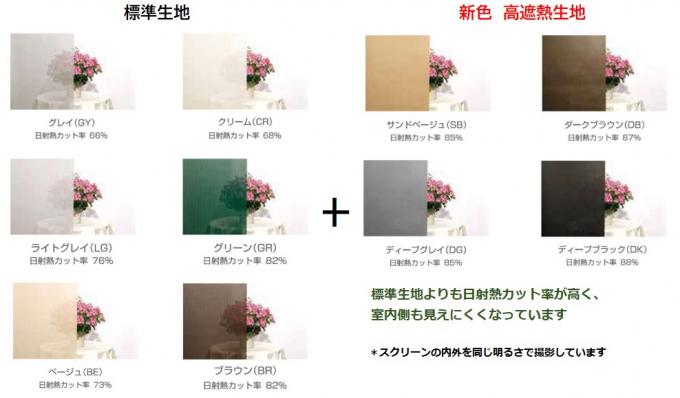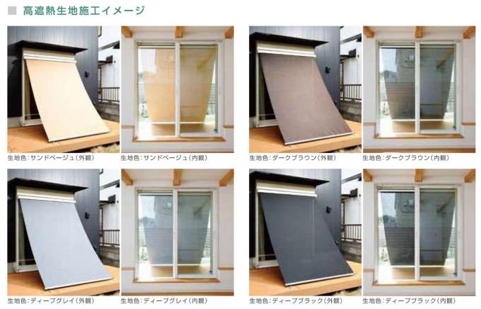 今回追加した⾼遮熱⽣地は、85〜88%の⽇射熱をカットできるもので(※)、サンドベージュ、ディープグレー、ダークブラウン、ディープブラックの4⾊となっております。オーソドックスで外壁の⾊に合わせやすく飽きの来ないカラーを揃えました。