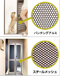 また、スチールメッシュタイプはスチール板をメッシュ状に加工したもの。一般的な網戸のメッシュと同等の開口で防虫性も十分に確保されています。