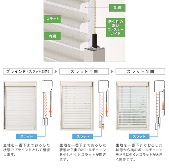 生地を下まで降ろした状態で目隠し効果のある「ブラインド」として使用することができ、その状態から更にボールチェーンを引くことでスラットが開き、「網戸」として使用することができ、一台で二役を手軽な操作で実現した多機能商品です。