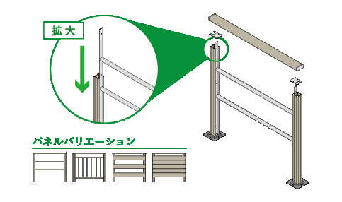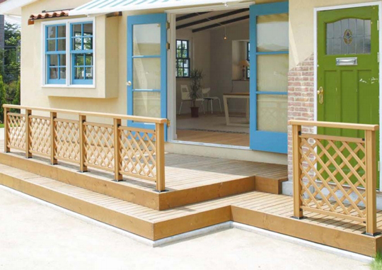 デッキフェンスは支柱に付子状の格子のデザインパネルを差し込み、ビス留めするだけの簡単施工。支柱の仮置きから取り付けまでスムーズに行うことができます。