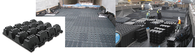 『アクアロード』は、道路地下に適用可能な樹脂製貯留浸透槽として使われる構造部材です。