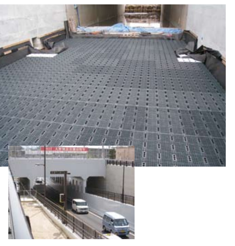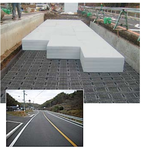 車道を横断するBOXカルバートへの荷重を軽減する軽量盛土として採用された。(EPSブロックと併用)