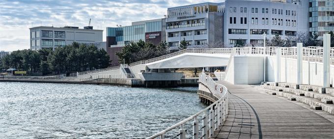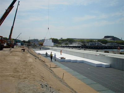 護岸整備事業における人道橋の架橋計画において、本水路は航行する船舶の都合上、一定の高さの確保が必要であったため、護岸上の橋梁取付部に盛土が必要になりました。検討の結果、護岸そのものへの影響を最小限にするためEDO-EPS工法が採用されました。